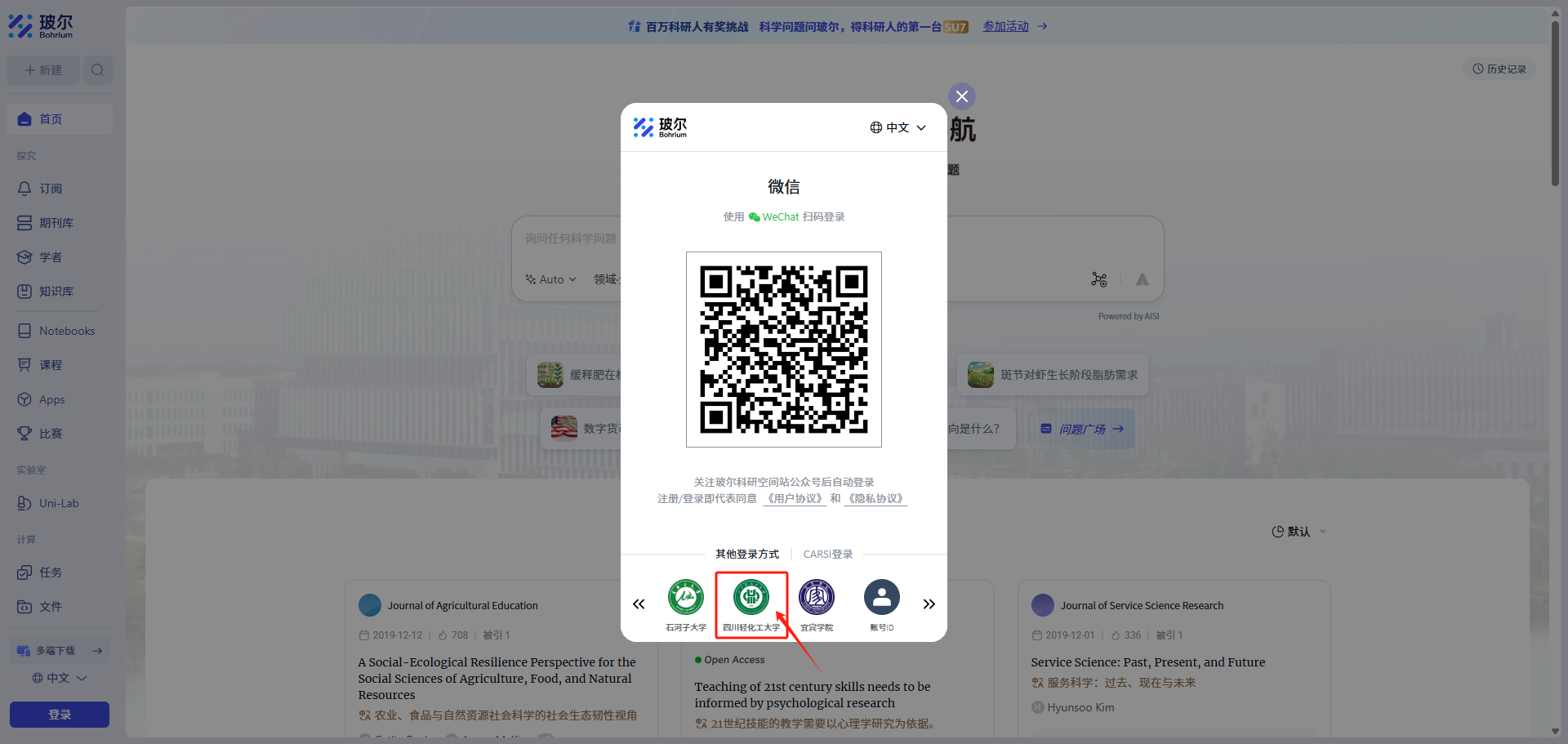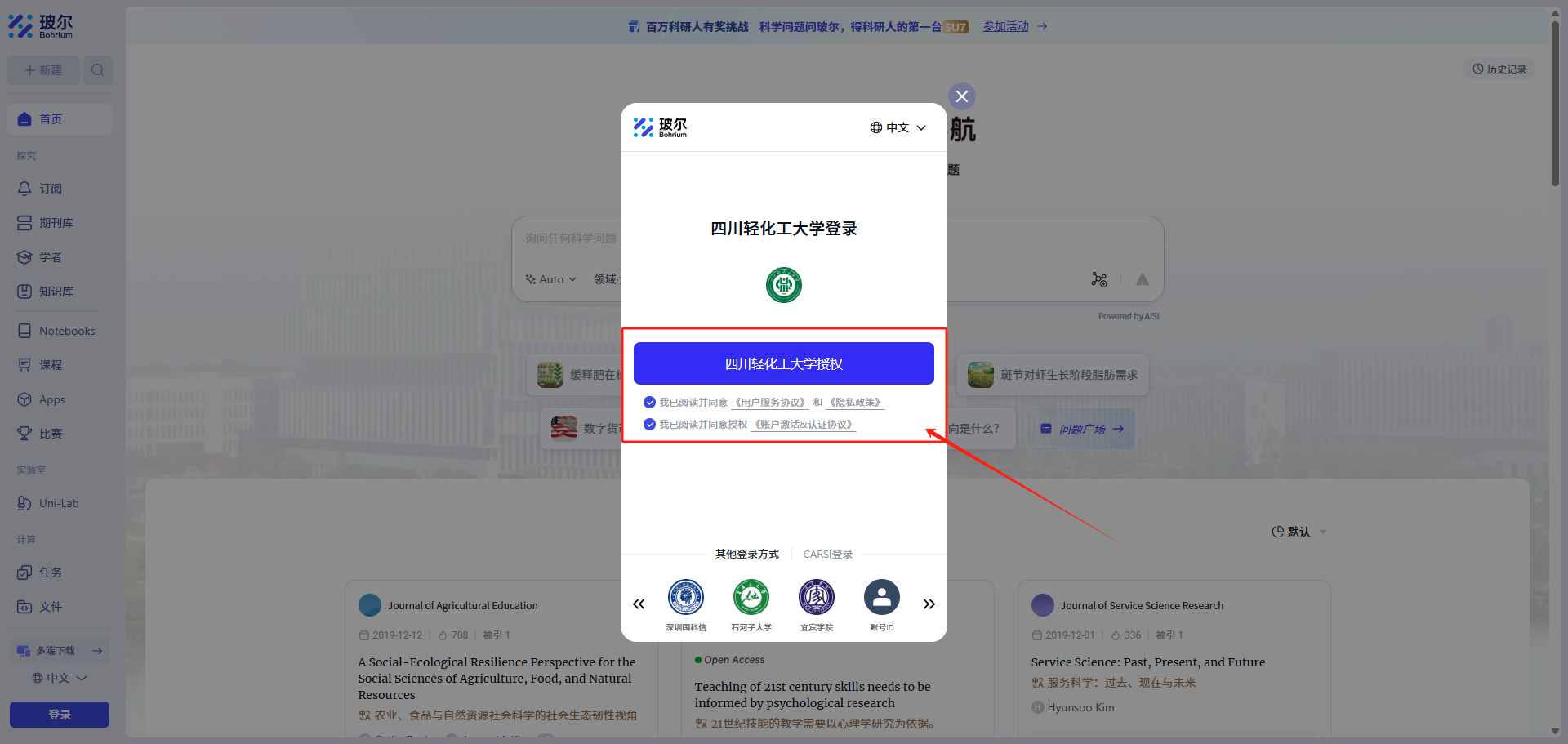 在浏览器中输入https://suse.bohrium.com/进行访问,打开页面后点击左下角登录图标,在登录窗口底部选择“机构登录”,点击“四川轻化工大学”图标,在授权界面勾选并同意授权,然后在弹出的统一身份认证界面输入本校统一身份认证账号、密码进行登录。