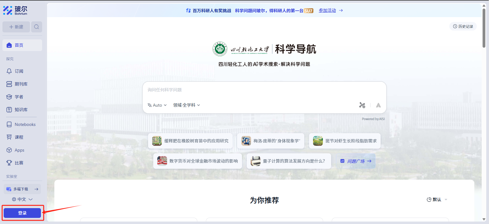 在国家加速推进教育数字化转型浪潮下,数字校园处按照学校工作要求,从如何运用AI技术为科学研究赋能、为学科建设和硕士研究生培养提供保障、为本科生研究素养提升提供助力等维度出发,经过调研分析和多方会谈,学校与北京深势科技(宜宾)有限公司达成合作意向,该公司向我校提供“玻尔—科研空间站”平台的一年的使用权,供我校全体在校师生免费体验使用。数字校园处已将该平台接入学校统一身份认证系统,诚邀全校师生参与体验,希望能给老师和同学们的学习研究带来有益帮助。