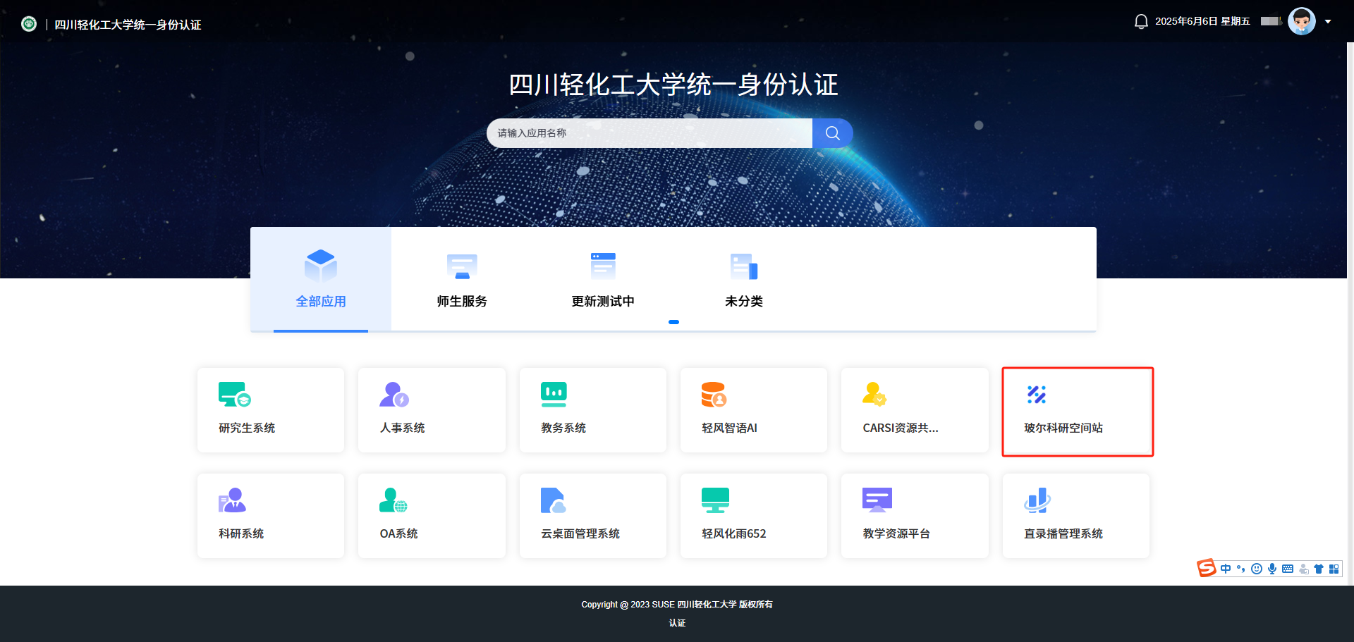 登录“四川轻化工大学统一身份认证平台”,在统一身份认证界面找到“玻尔科研空间站”图标,点击即可跳转访问并自动完成身份认证。首次访问需进行授权。具体位置如图所示: